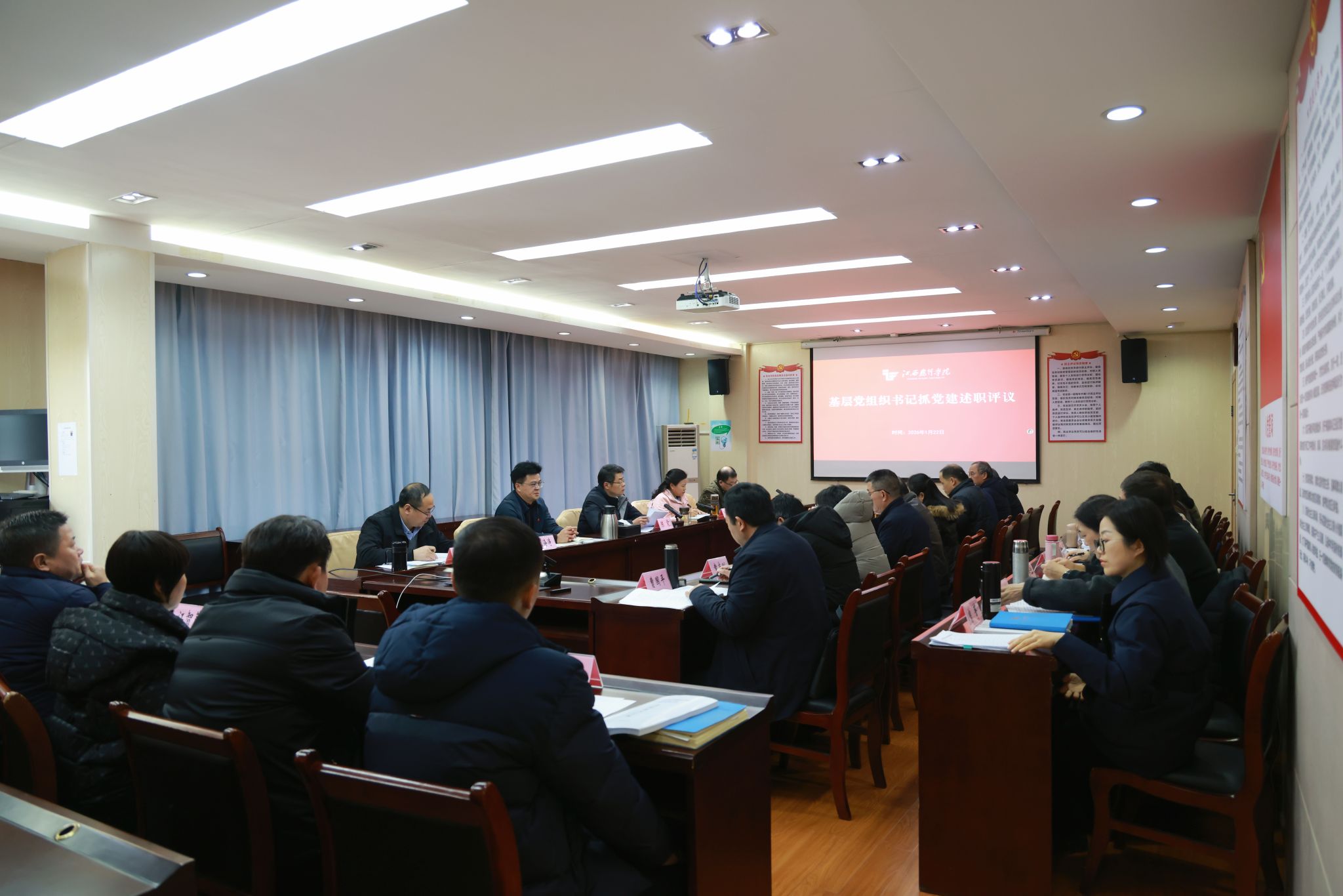 1月22日下午,江西飞行学院2025年度基层党组织书记抓基层党建述职评议会在行政楼四楼会议室召开。校党委书记陈震主持会议并作总结点评,校长龙国英,党委副书记张海涛,党委委员、副校长郭军华,副校长欧阳剑雄出席会议,机关党委、各二级学院党总支书记及直属党支部、机关党支部书记参加会议。